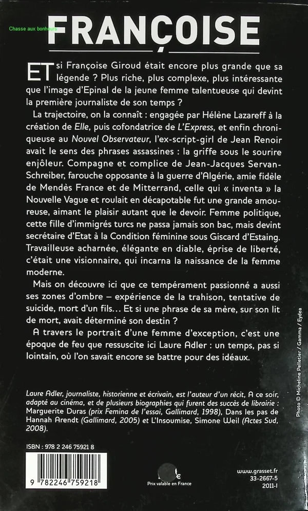 Wir kennen den Werdegang: Sie wurde von Hélène Lazareff bei der Gründung von Elle eingestellt , war dann Mitbegründerin von L'Express und schließlich Kolumnistin beim Nouvel Observateur . Das ehemalige Scriptgirl von Jean Renoir hatte ein Händchen für umwerfende Sprüche: das Markenzeichen unter dem charmanten Lächeln. Sie war Gefährtin und Komplizin von Jean-Jacques Servan-Schreiber, erbitterte Gegnerin des Algerienkriegs, treue Freundin von Mendès France und Mitterrand, die die Nouvelle Vague „erfand“ und Cabrio fuhr, eine große Liebhaberin, die das Vergnügen ebenso liebte wie die Pflicht. Als Politikerin machte die Tochter türkischer Einwanderer nie ihr Abitur, wurde aber unter Giscard d'Estaing Staatssekretärin für die Rechtsstellung der Frau. Sie war eine fleißige Arbeiterin, von teuflischer Eleganz, freiheitsliebend – eine Visionärin, die die Geburt der modernen Frau verkörperte.