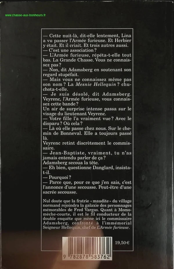 Warum? Weil es, soweit ich weiß, die Ankündigung eines Schocks ist. Vielleicht eines echten Schocks. Es besteht kein Zweifel, dass die „verfluchten“ Geschwister aus dem normannischen Dorf zu Fred Vargas' Galaxie unvergesslicher Charaktere hinzustoßen werden. Was Momo-mèche-courte betrifft, so ist er der rote Faden der Doppelermittlung, die hier von Kommissar Adamsberg geleitet wird, der mit dem uralten Lord Hellequin, dem Anführer der Furious Army, konfrontiert wird.
