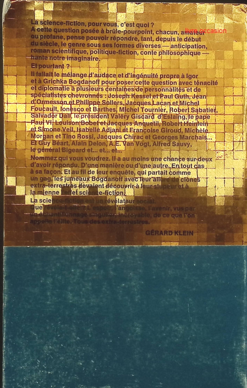 Nommez qui vous voudrez. Il a au moins une chance sur deux d'avoir répondu. D'une manière ou d'une autre. En tout cas à sa façon. Et au fil de leur enquête qui partait comme un gag les jumeaux Bogdanoff avec leur allure de clones extra-terrestres devaient découvrir à leur stupeur et à la mienne l'effet science-fiction.