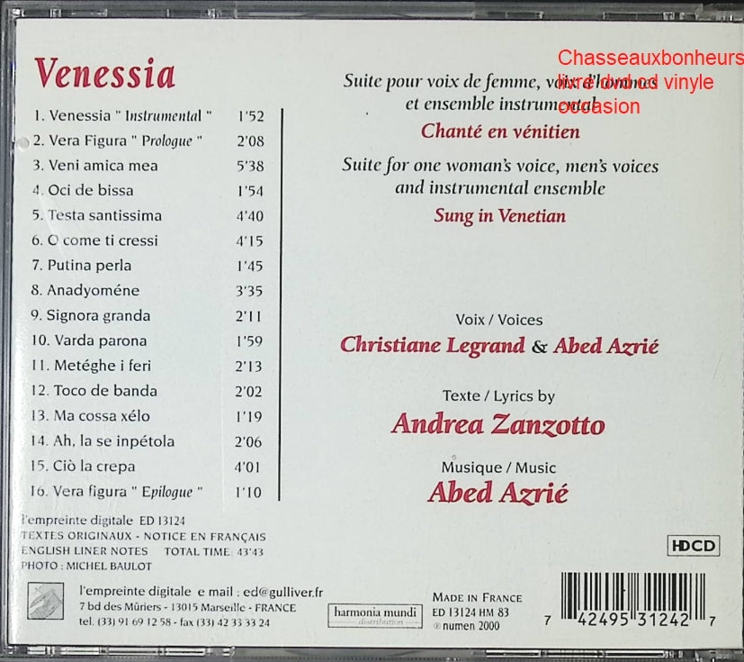 Titre : CD Abed Azrié – Venessia, musique du monde orientale, influences arabo-andalouses et poésie musicale - CD RésuméVenessia est... En savoir plus
