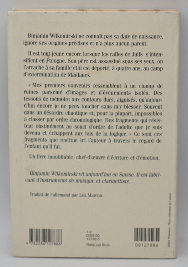 Titre : Fragments - Une enfance 1939-1948 - Binjamin Wilkomirski - livre Résumé : Binjamin Wilkomirski grandit sans connaître sa date... En savoir plus